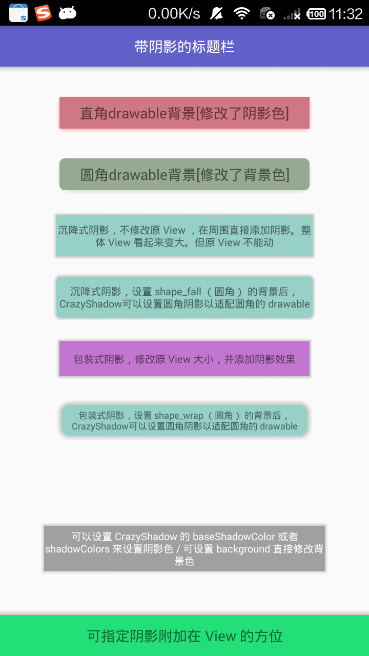 CrazyShadow 是一个专门为 View 添加阴影效果的库。 CrazyShadow 支持自定义阴影实现方式、阴影颜色、阴影经度大小、阴影附加方位。