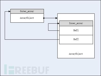 序列字符串的本意是定义一个数组,其中包含一个ArrayObject,对象ArrayObject里又包含一个内部数组,内部数组成员是两个引用,一个指向外部数组,一个指向内部数组。但是经过反序列化和垃圾回收之后,外部数组的内存被释放了,但PHP并不知道从而导致Use After Free。