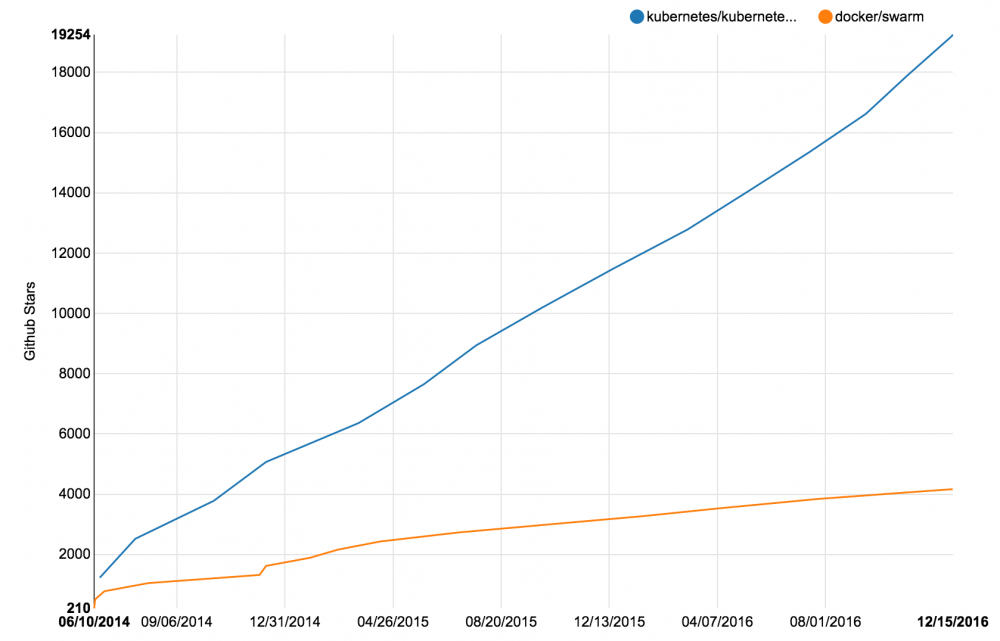 还有一种可能性是Docker公司依靠Docker Swarm这样一个独立的、以单容器操作API为核心的项目来完成PaaS的使命(业界基于Swarm构建PaaS的用户不在少数)。但现实是,几乎同时发布的Google Kubernetes项目却出人意料地狙击了Swarm的发展势头。下图是自发布起,Swarm项目和Kubernetes项目GitHub Star数目的变化统计。