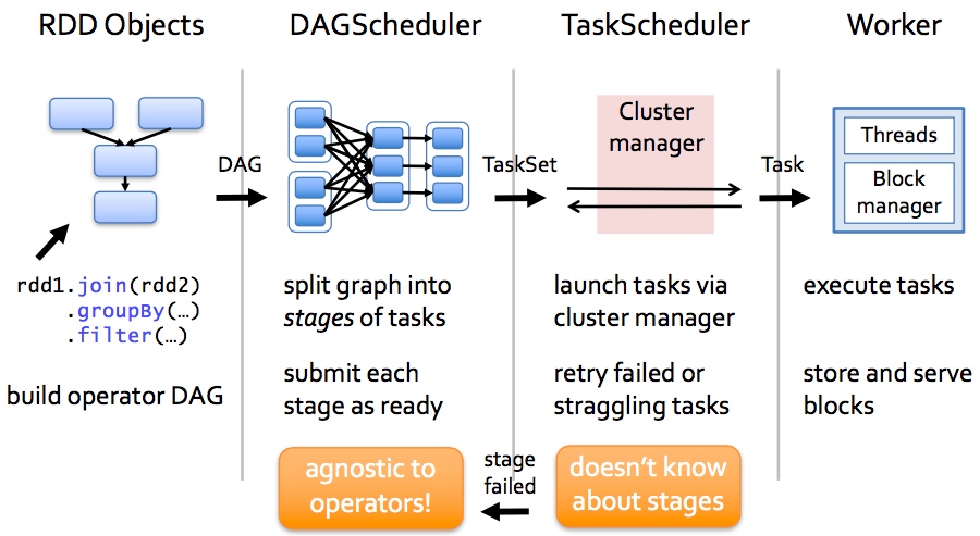开始正题之前,先简单介绍一些Spark的基本概念,以便深入介绍RDD。Spark的api运算函数分为两大类, Transformation 和 Action :Transformations是 lazy evaluation 的,调用他们只会被记录而不会被真正执行,只有遇到Actions,之前的Transformations才会被依次执行,这样的 Delay Scheduling ,Spark可以看到完整的计算流程图(以DAG有向无环图的形式表示),从而做更多的优化,Actions会返回结果给Driver或者保存结果到external storages。Spark的基本工作流程是,用户提交程序给cluster,用户的main函数会在 Driver 上面运行,根据用户的程序Spark会产生很多的 Jobs ,原则是遇到一个 Action 就产生一个 Job ,以DAG图的方式记录RDD之间的依赖关系,每一个Job又会根据这些依赖关系被DAGScheduler分成不同的 Stages ,每一个Stage是一个 TaskSet ,以TaskSet为单位,TaskScheduler通过Cluster Manager一批一批地调度到不同node上运行,同一个TaskSet里面的Task都做同样的运算,一个Partition对应一个Task。这个工作流程其实就是Spark的Scheduling Process,附上超经典的示意图,不要纠结这图上的细节,后面会有专门的笔记详细介绍这张 藏宝图 :