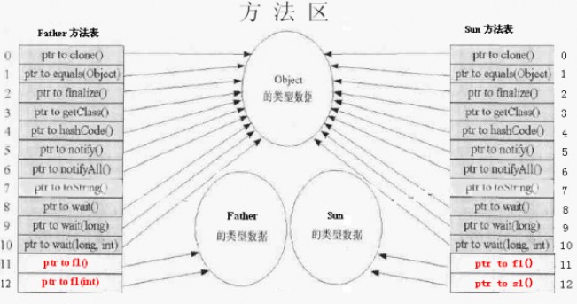 上面的源代码中有三个重要的概念:多态(polymorphism) 、方法覆盖 、方法重载 。打印的结果大家也都比较清楚,但是JVM是如何知道f.f1()调用的是子类Sun中方法而不是Father中的方法呢?在解释这个问题之前,我们首先简单的讲下JVM管理的一个非常重要的数据结构——方法表 。