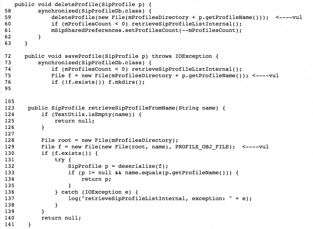 漏洞位于负责sip账户序列化和反序列化的SipProfileDb.java中。见deleteProfile、saveProfile和retriveSipProfileName等方法,存在目录穿越,mProfileDirectory和Sip profile name(形式为:sip账户@sip主机名)未经检查就直接拼接在了一起,而Sip profile name允许存在包括’/’和’..’等在内的特殊字符,因此本地攻击者可以通过构建包含这些特殊字符的Sip profile name,将sip序列化文件存储于属于radio用户的的任意目录。