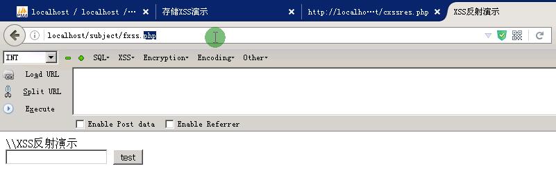 然后访问 xss.php ,像之前一样输入 HTML 代码并点击 test ,如下: