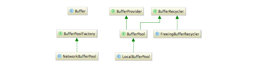 BufferRecycler接口有一个名为FreeingBufferRecycler的简单实现者,它的做法是直接释放内存段。当然通常为了分配和回收的效率,会对Buffer进行预先分配然后加入到Buffer池中。所以,BufferRecycler的常规实现是基于缓冲池的。除此之外,还有另一个接口BufferProvider(它约定了Buffer提供者如何以同步和异步的模式提供Buffer)共同作为缓冲池(BufferPool)的基接口。