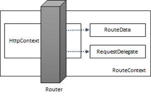 如上面的代码片段所示,针对请求实施路由解析的RouteAsync方法的输入参数是一个类型为RouteContext的上下文对象。这个RouteContext实际上是对一个HttpContext对象的封装,Router可以利用它得到所有与当前请求相关的信息。如果Router完成路由解析并判断当前请求与自身的路由规则一致,那么它会将解析出来的路由参数转换成一个RouteData并存放到RouteContext对象代表的上下文之中,另一个一并被放入上下文的是代表当前请求处理器的RequestDelegate对象。下图基本上展示了RouteAsync方法试试路由解析的原理。