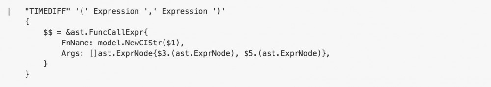 如果想引用这个规则中某个 token 的值,可以用 $x 这种方式,其中 x 为 token 在规则中的位置,如上面的规则中,$1 为 "TIMEDIFF",$2 为 ’(’ , $3 为 ’)’ 。$1.(string) 的意思是引用第一个位置上的 token 的值,并断言其值为 string 类型。