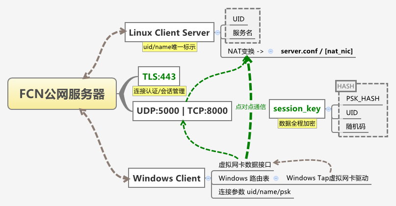 fcn公网服务器不会收集用户的任何网络数据,同时支持用户网络数据强制点对点通信。后期考虑开放用户加密接口,以便用户实现自定义的端到端私有加密。