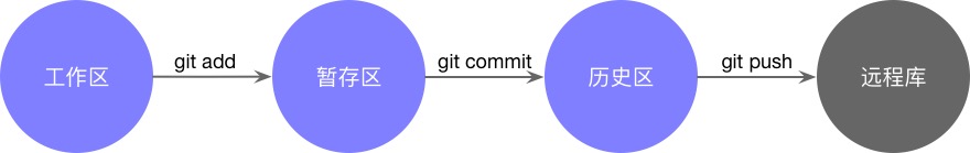 如图所示,Git的 add 操作会将文件的修改记录保存在 暂存区 ,之后进行的 commit 操作会将暂存区的修改内容全部提交到 历史区 ,最后进行的 push 操作将会把本地的操作记录推送到 远程仓库 中去。 之所以此处远程库的背景色使用了暗色调,是因为推送到远程库的代码是需要你“负责”的,一旦发布即是历史的诞生,请对 push 的操作保持敬畏和责任感。同时这里也牵涉到Git中 提交哲学 的概念。