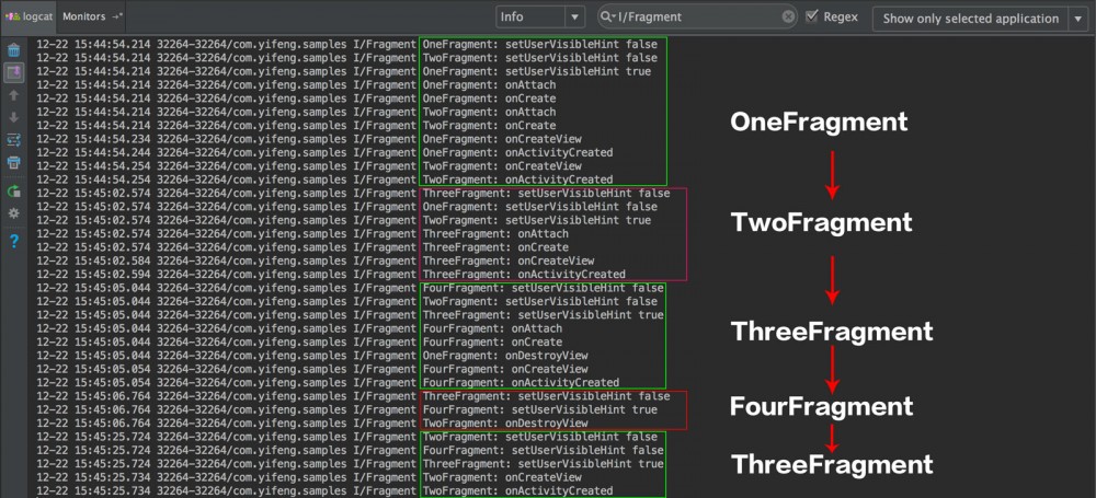 setUserVisibleHint 和 各个生命周期函数,添加日志打印。然后新建四个子类,分别命名为 OneFragment、TwoFragment、ThreeFragment 和 FourFragment,按照基本使用方法写好代码,运行并滑动页面,查看日志打印。