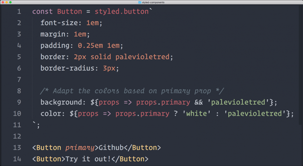 因为 styled-components 允许我们以函数的形式表现css的值,我们可以切换不同样式基于传入组件的 props 值,而不是像经典的写法添加新的类到 HTML 中。
