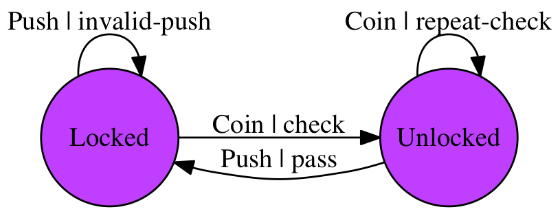 它有两个状态: Locked 、 Unlocked 。有两个输入(input)会影响它的状态,投币(coin)和推动转臂(push)。