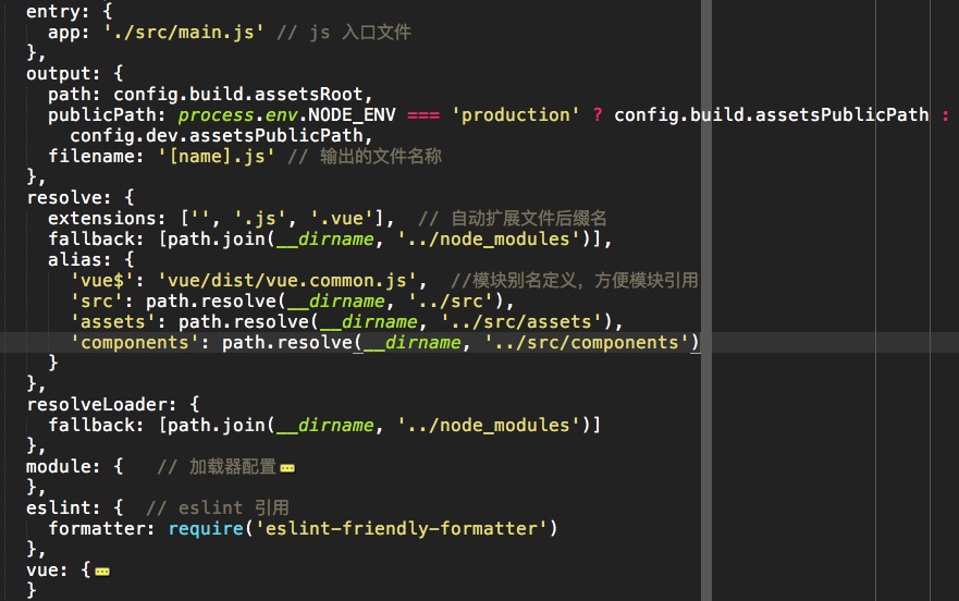 框架初始化后,我们可以在 build 文件夹中的 webpack.base.conf.js 查看到 webpack 的基本配置,如下: