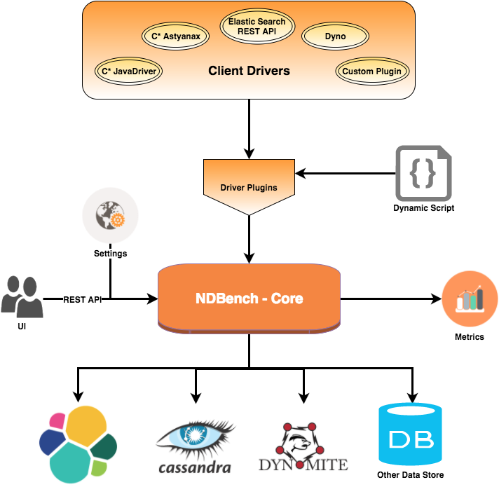 目前为止,NDBench 提供了如下几种客户端插件—— Datastax Java Driver (CQL)、 C* Astyanax (Thrift)、Elasticsearch API 和 Dyno (Jedis support)。 也可添加其他插件,或者用户可以使用如 Groovy 这样的动态语言来添加新的工作负载。每个驱动都是一个 驱动插件 接口的实现。
