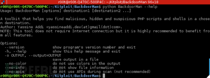Usage: BackdoorMan [options] destination1 [destination2 ...] A toolkit that helps you find malicious, hidden andsuspicious PHP scripts and shells in a chosen destination. Author: Yassine Addi. NOTE: This tool does not require Internet connection but itis highly recommended to benefit from all features. Options: --version show program's version number andexit -h, --help show this help message and exit -o OUTPUT,--output=OUTPUT save output in a file --no-color do not use colors in the output --no-info do not show file information --no-apis do not use APIs during scan (notrecommended)