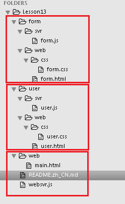 两个模块文件夹中又分别有存放后端文件的 svr 文件夹和存放前端文件的 web 文件夹,web 文件夹中的文件有时还可进一步细分为 JavaScript 文件、CSS 文件、图片文件、网页文件等。再加上项目的主 web 目录和主程序,项目文件夹的结构如下图所示: