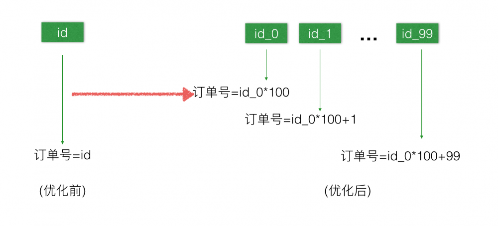 如下图,由原来一个表分配改为100张表同时分配,业务逻辑上根据不同的表名执行一个简单的运算得到最终的订单号。