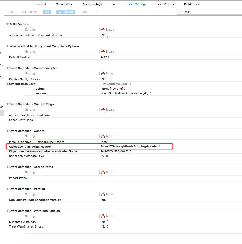接下来进行分析错误,由于Swift只支持动态库(并非完全意义的动态库),所以我们的代码在Pod之后实际上是一个动态的Framework,在这个名为Mixed的FrameWork里面,Objectice-C源代码是存放在Mixed的命名空间,所以不需要Mixed-Bridging-Header.h也是可以的。而且也能正常的访问。所以问题出现在Objective-C调用Swift的部分。 由于Swift是有命名空间的概念的。制作之后的Mixed-Bridging-Header位于Mixed的命名空间内。由于CocoaPods对源代码做的操作只是简单的复制。并不能修改源代码。我们就需要在源头做手脚。 修改源工程的设置