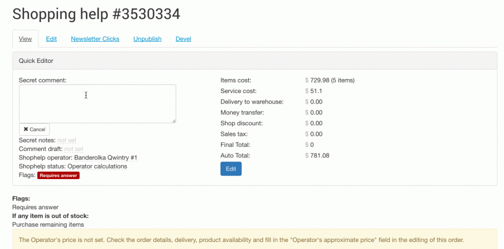 就地编辑复杂的订单节点对象。这个功能包括为客户生成票据以及快速对商品进行编辑。它要求提供基本的JSON API来加载和保存节点数据,没有什么特别的,就是一些菜单回调函数。