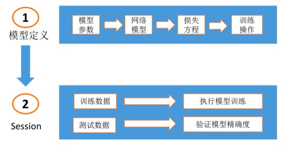 TensorFlow的应用架构主要包括模型构建,模型训练,及模型评估三个方面。模型构建主要指构建深度学习神经网络,模型训练主要指在TensorFlow会话中对训练数据执行神经网络运算,模型评估主要指根据测试数据评估模型精确度。如下图所示:
