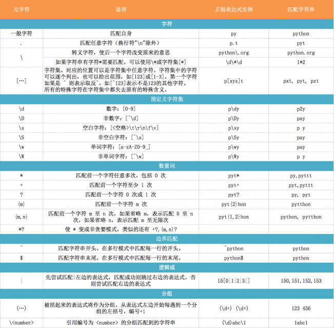 正则表达式有多种不同的风格,下表列出了适用于 Python 或 Perl 等编程语言的部分 元字符 以及说明: