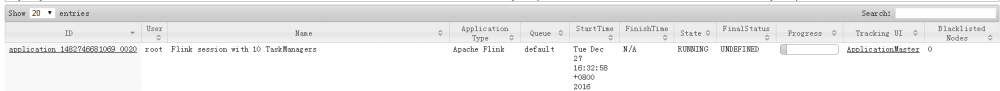 - Yarn中能看到两个任务,分别有两个ApplicationMaster,对应Flink的JobMananger。