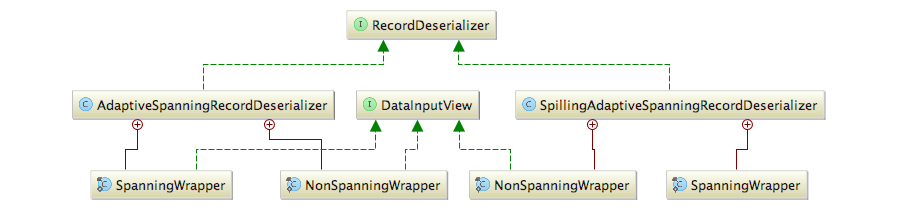 虽然不同的反序列化器有各自适用的场景,但它们的实现绝大部分是类似的,主要的差别在于两者对SpanningWrapper的实现上。AdaptiveSpanningRecordDeserializer主要应用了临时缓冲区在内存中处理跨段数据的读取,而SpillingAdaptiveSpanningRecordDeserializer则有一个溢出阈值(5MB),如果记录的数据大于这个阈值将会采用临时文件来将溢出数据写入到临时文件中,然后再从溢出文件对应的文件流构建数据输入视图(DataInputViewStreamWrapper)进行读取。由于支持大记录的SpillingAdaptiveSpanningRecordDeserializer在数据大小不大于溢出阈值时处理方式跟AdaptiveSpanningRecordDeserializer类似,所以SpillingAdaptiveSpanningRecordDeserializer能适应更一般的场景,更具实用性,这也导致了在源码中没有见到AdaptiveSpanningRecordDeserializer的使用踪迹。
