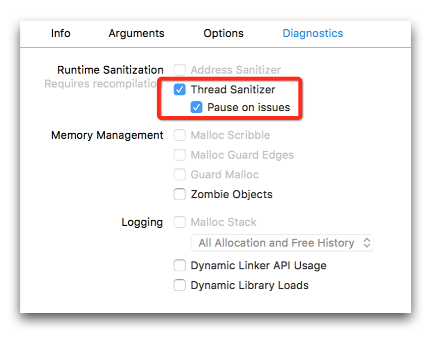 启用Thread Sanitizer的方式很简单,只需要在Xcode的schema中勾选Thread Sanitizer即可,如下图: