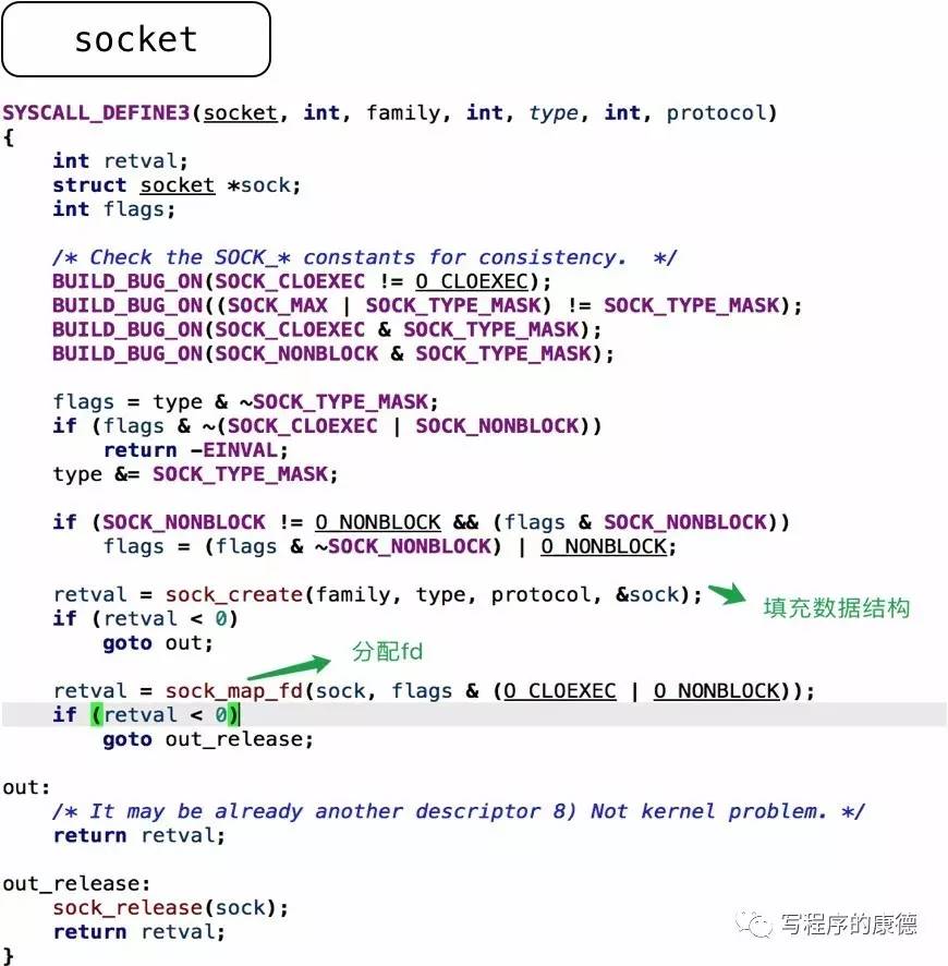 调用 socket 函数的时候内核会分两步操作——填充数据结构,分配fd。我们重点看 socket_map_fd
