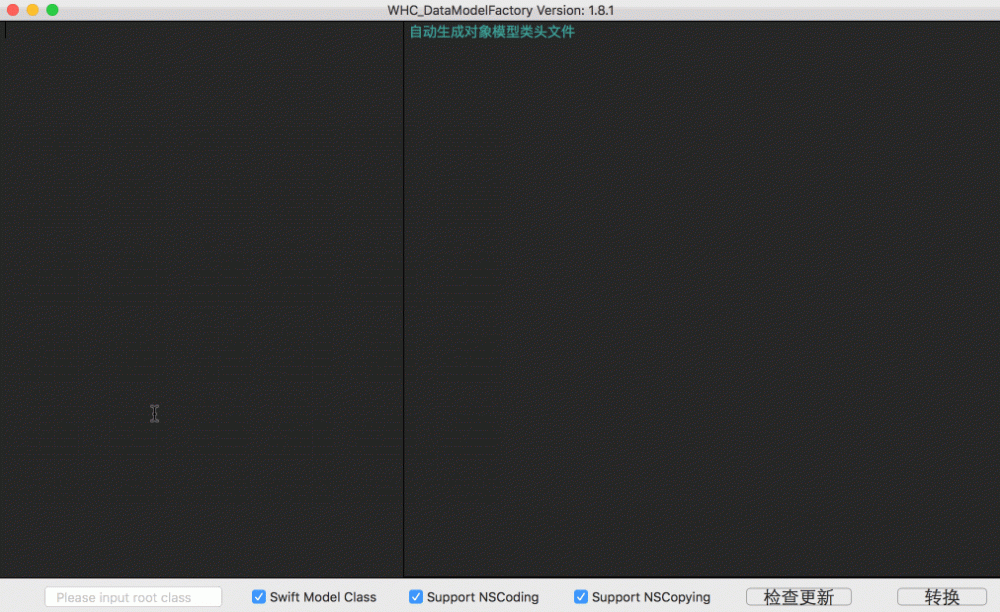 自动把json或者xml字符串自动生成模型类文件内容;避免手工创建模型类的麻烦和错误率(提高开发效率);自动生成类名称首字符大写 ;生成的模型类与WHC_Model解析json库完全匹配;支持xml/json字符串和dictionary字符串。