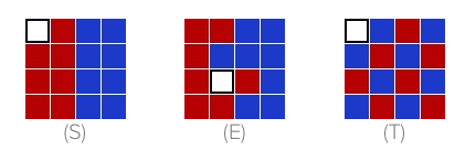 首先你的起点是S图,每移动一次(上下左右四个方向)白色的方块都会和称动方向相邻的方块交换位置。 经过RDRDL(U=上,D=下,L=左,R=右,下同)后变成E图。你的目标是用最少的步数变成T图。 规则说明图