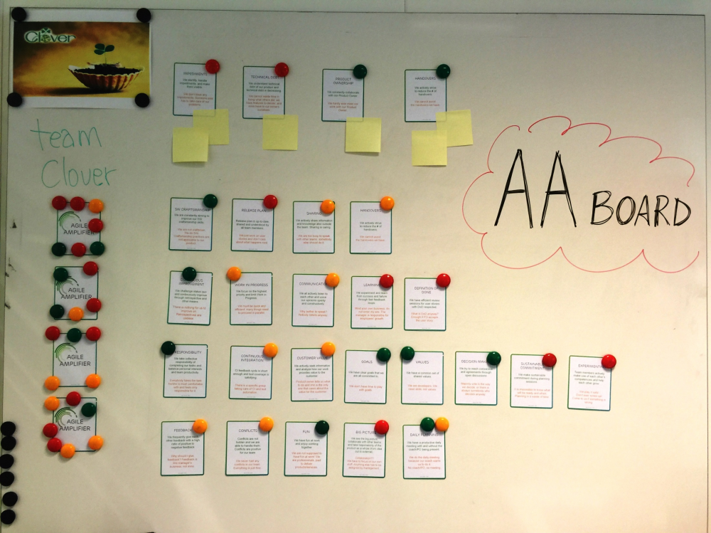 我们开发了一个框架称为敏捷放大器(AA),这个工具列出了敏捷组织生态系统中高效的、功能完备的团队和个人所需的技能和行为。每个团队可以对比这些技能和行为进行自我评估,明确优势以及要改进的地方,选出未来3-6个月内最想要做的2-3件事,然后再做一次自我评价。一些团队正在使用下图所示的AA板来跟进他们的目标和改进的动作: