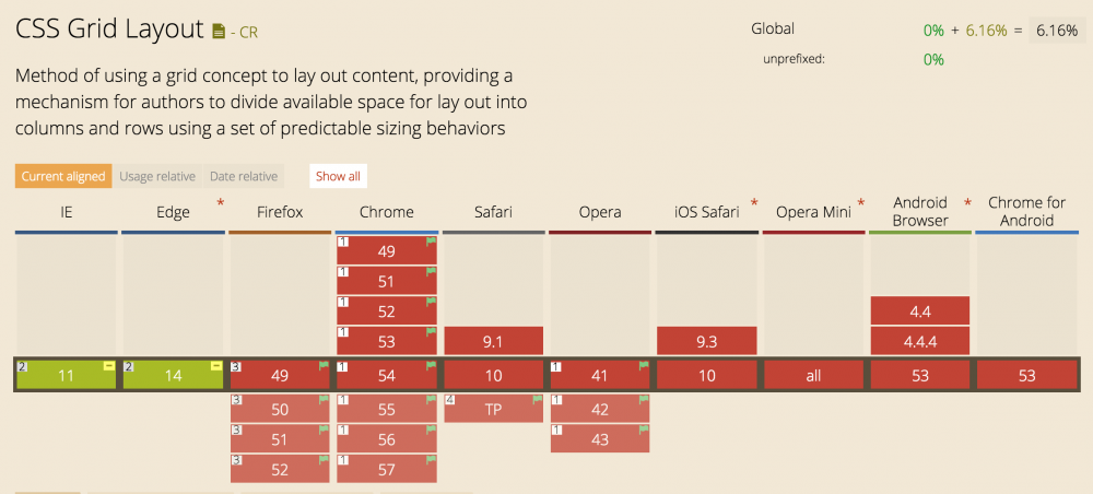 好消息是 CSS Grid Layout Model 是一个转折点,我们可以用它的一些基础功能就可以重建一些标准布局。目前,浏览器对网格布局的支持情况还不是很理想。唯一支持它的浏览器是Edage和最新的Internet Explorer 。幸运的是,我们可以在Google Chrome,FireFox ,Safari 上手动启用该功能,在Chrome上我们在导航栏输入 chrome://flags 切换到“启用实验性Web平台”标识并重启浏览器,FireFox上我们在导航栏输入 about:config , 搜索 layout.css.grid.enabled 设置为 true ,Safari上我们需要下载 Safari Technology Preview 版本的浏览器,就可以使得浏览器支持网格布局。