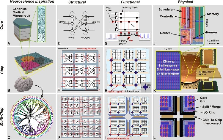 对应的,真北架构下,也分为这三个层次。先做了一个核团对应的硬件——neurosynaptic core,每个core由256个输出与输入、以及对应的系数存储,并集成了神经信号的路由器(router)使得信号可以在长距离上游走;在此基础上,一块芯片有64乘64个这样的核团,共4096个,组成了一个“功能区”。而很多完整的应用和复杂的任务,还需要芯片与芯片间的互联,实现一个完整的皮层功能。看,这才是真正的神经形态的“电脑”。