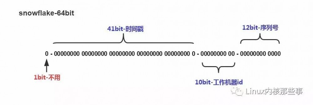 既然不能单纯靠时间戳来保证唯一性,那么是不是可以增加以下特征值来保证呢?为此,Twitter公司发明了snowflake算法。snowflake算法的核心原理是把一个64位的整数分为3个部分,如下图: