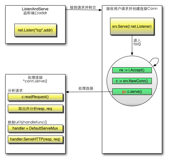 总的感觉Go对Server, conn, handler, mux 这些对象直接的关系没有Python 那样清洗,他们直接的关系总是感觉有点微妙,对Go的特性比较属性了或许就会很好吧。