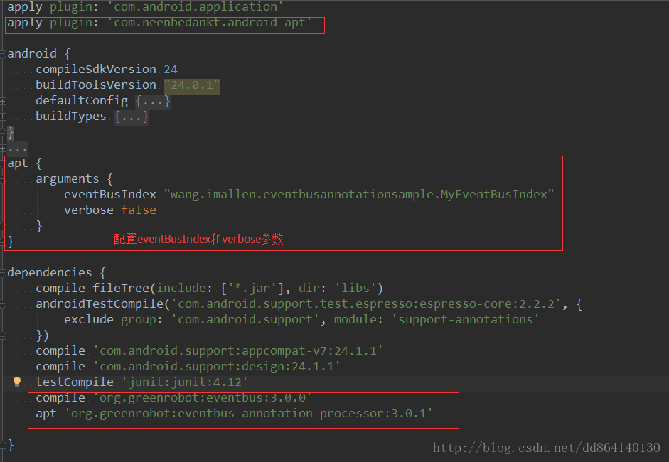 对于Butter Knife,EventBus 3.0这类工具,最终我们都需要在自己项目引用注解处理器生成的代码,因此需要为其配置Android-apt。EventBus 3.0的注解处理器还接受两个参数,当然也要借助Android-apt插件了,以EventBus在工程的配置为例: