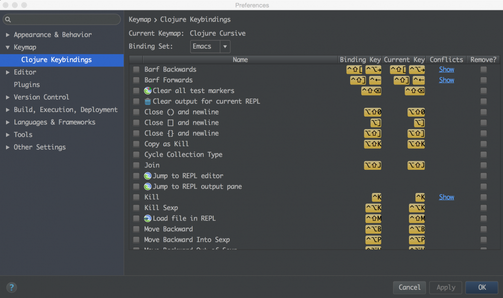 而且 Emacs 本身就是个用 Lisp 方言写的“操作系统”,对以括号著称的 Lisp 语言有天然的支持,括号匹配主要是 Paredit mode,可以方便的把括号作为一个整体操作,不过像 Cursive 这种插件也集成了 Paredit 的主要功能,所以不用 Emacs 的同学也不用担心,毕竟 Emacs 学习成本实在是太高,我个人觉得比 Vim 有过之而无不及,相对于 Vim 的模态概念,Emacs 里面通过 Ctrl 与 Meta 键来与一般按键区别,这里我们不必对某个编辑器有过多的偏见,它们都是生产力的工具而已,写好代码才是重要的。