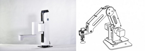 跟现在市面上比较普及的工业级机械臂相比, 最大的区别 在于,将Z轴上下运动的机构放在远离机械臂末端的位置,其优势是减小末端负载,使整机重心移到靠近机械臂固定于桌面的位置,有利于于其力学性能的优化。