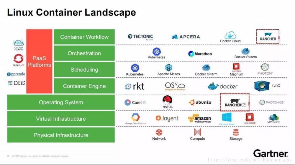 今年八月在Gartner报告中,作为容器管理平台的Rancher和操作系统的RancherOS均位列Linux Container Landscape之上,足见Rancher在世界范围的领先地位和受到的充分肯定。