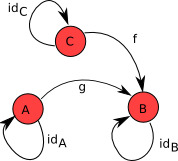 下图展示了一个简单的范畴,该范畴由对象 A, B 和 C 组成,有三个单位态射 id_A, id_B 和 id_C ,还有另外两个态射 f : C => B 和 g : A => B 。