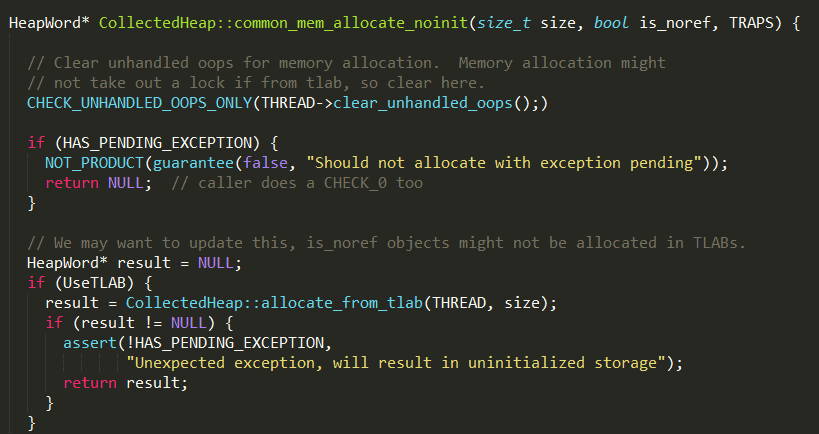 新建一个对象时,由对应的instanceKlass对象计算出需要多大的内存,并调用CollectedHeap的common_mem_allocate_noinit方法分配指定大小的内存,实现如下:
