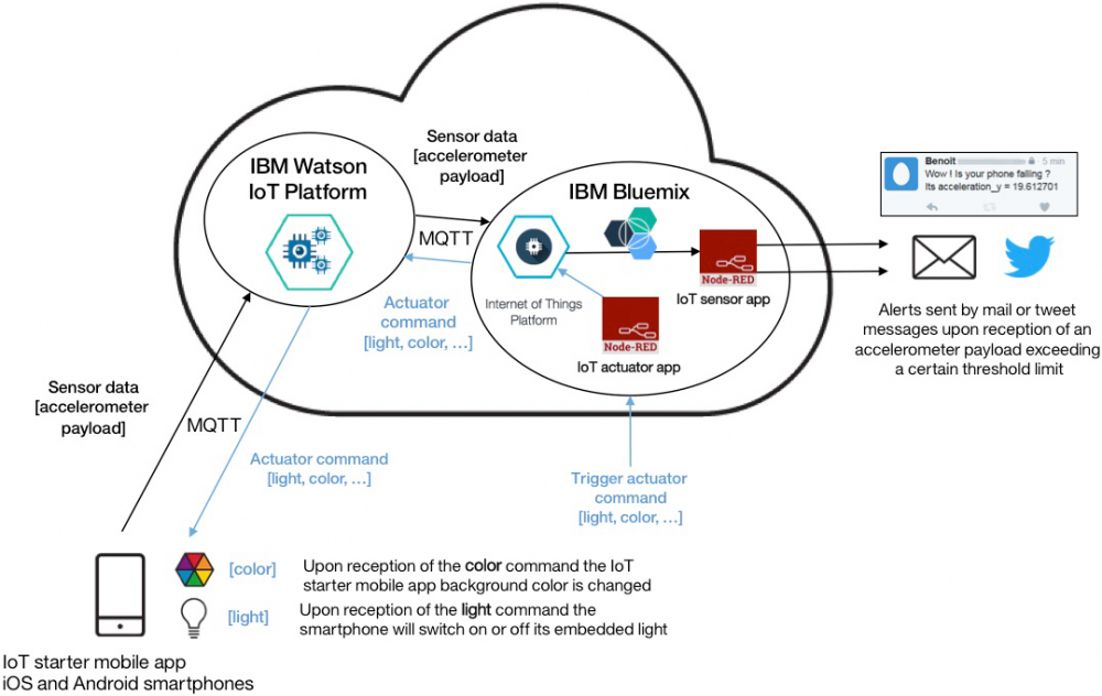 您将在智能电话上使用一个 IoT Starter Mobile 应用程序。为了将智能电话转换为传感器,我们将构建一个 IoT 应用程序来读取从智能电话发送的 加速计 值,并在这些值达到某个阈值时以一个具体的操作作为反应。为了将智能电话转换为执行器,我们将构建一个 IoT 应用程序来向智能电话发送特定的命令,然后智能电话能对它收到的命令做出反应。