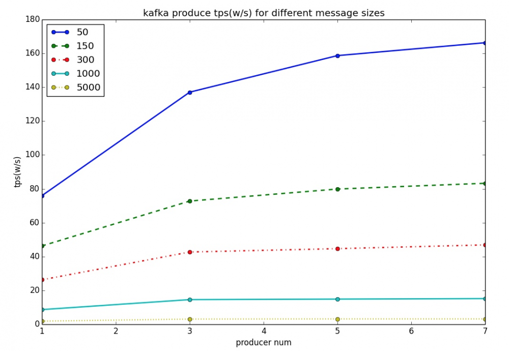 从上图可以看出,当单个消息体为50字节时,kafka单机的吞吐量确实表现出色,能达到百万级。可是当单个消息体为5k字节时,TPS极速下降,只有大约3万多,少了两个数量级。