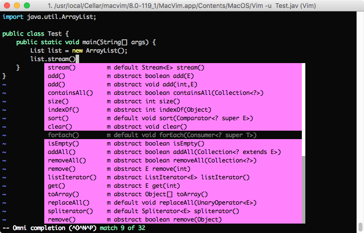 还是由 Vim 自动添加上去的,所以在 Vim 中只需直接输入 ImmutableMap. , 再按下 ctrl - x ctrl - o , 不光提示方法,还自动加上 import 语句,真有点像是在 IDEA 中写代码,从此可以在 Vim 中进行快乐的 Java 编程了。