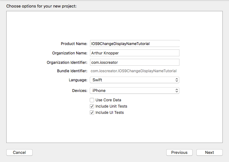 打开 Xcode,创建一个 Single View Application。点击 Next,product name 一栏填写 IOS9ChangeDisplayNameTutorial ,填写好 Organization Name 和 Organization Identifier,Language 选择 Swift,Devices 选择 iPhone。