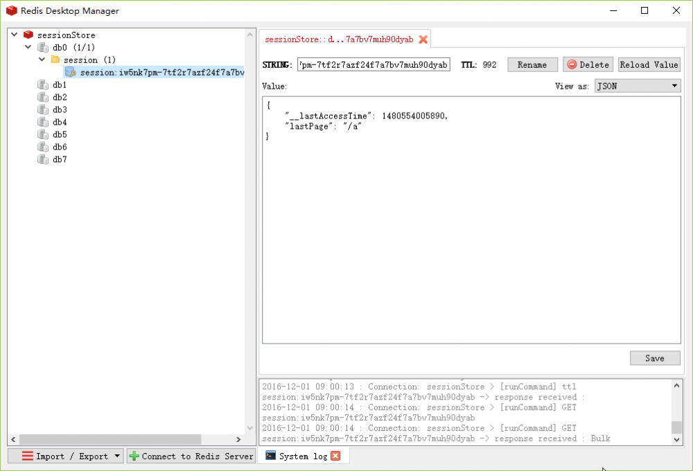 例如,用户访问 ‘/a' 网页后,Redis 中的 Session 显示为: