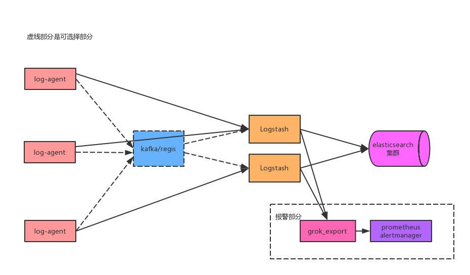 日志处理中,关键字报警是一个重要功能,对于监控报警主要用prometheus+alertmanager实现。应用运行过程中,根据日志关键字告警部的应用场景,从logstash部分对日志做分流(具体方案可以看上面图的报警部分),自研grok_export对日志进行过滤分析生成prometheus格式的数据,然后从prometheus配置报警策略通过alertmanager报警。log-agent本身也支持prometheus数据,prometheus通过特定的规则查看日志的统计信息。