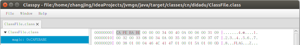 很多文件格式都会规定满足该格式的文件必须以某几个固定字节开头,这几个字节主要起标识作用,叫作魔数。class文件的魔数是”0xCAFEBABE”,可以参照classpy打开的ClassFile.class文件看下: