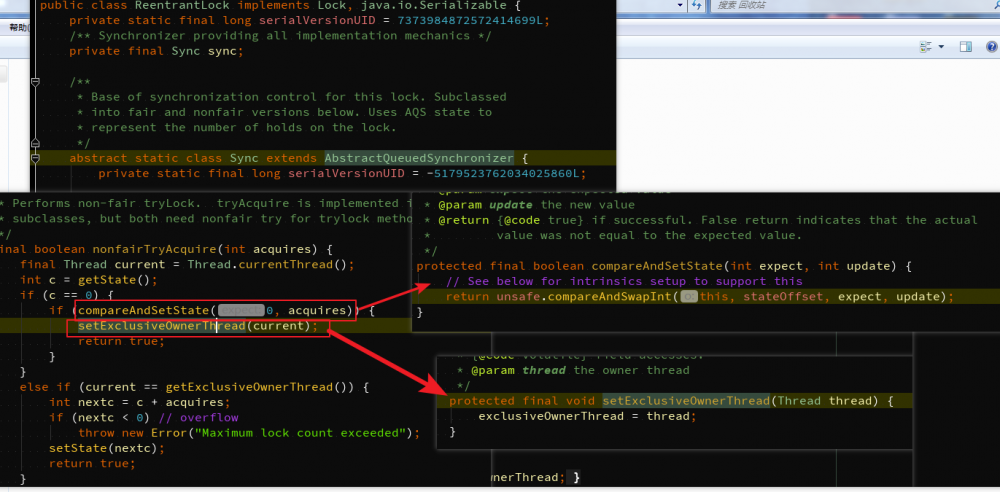 对于上面截图的代码说的直白点就是对于一个线程如果当前没有竞争,则直接拿到或者上锁,否则,尝试获取即acquire(1)方法: