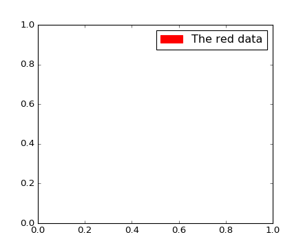 import matplotlib.patches as mpatches import matplotlib.pyplot as plt red_patch = mpatches.Patch(color='red', label='The red data') plt.legend(handles=[red_patch]) plt.show()
